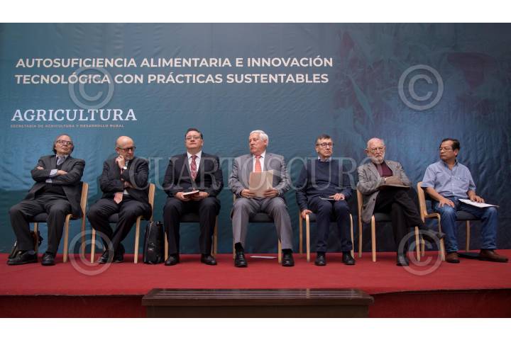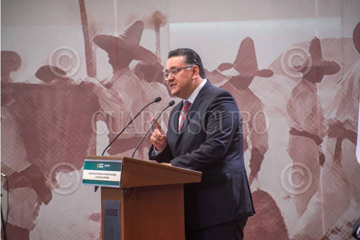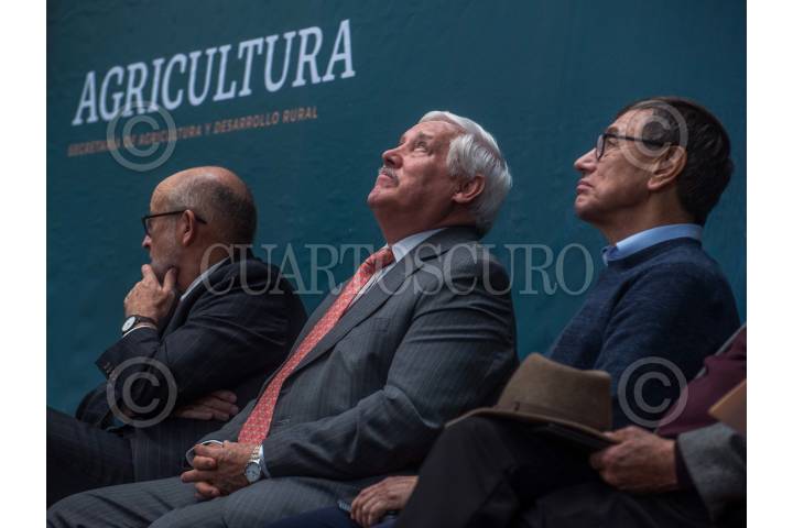 CIUDAD DE MÉXICO, 26NOVIEMBRE2019.- Víctor Villalobos Arámbula, titular de SADER, y Gabriel García Hernández, coordinador general de Programas Integrales para el Desarrollo de la Secretaría de Bienestar, encabezaron la quinta conferencia Autosuficiencia Alimentaria e Innovación Tecnológica con Prácticas Sustentables llevada a cabo en la explanada de Agricultura. Durante la conferencia, ambos funcionarios destacaron las acciones en la operación de los Centros Integradores de Desarrollo, con un enfoque de seguimiento en la entrega y aplicación de los apoyos dirigidos al rescate del campo, en 13 mil 500 comunidades rurales de alta y muy alta marginación en el país. En el evento también estuvieron presentes el subsecretario de Autosuficiencia Alimentaria, Víctor Suárez Carrera; el titular de la Comisión Nacional para el Conocimiento y Uso de la Biodiversidad (Conabio), José Sarukhán Kermez, entre otros. FOTO: ANDRÉS YÁÑEZ /CUARTOSCURO.COM
