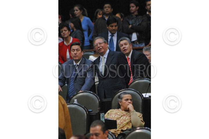 MÉXICO, D.F., 31OCTUBRE2009.- Guadalupe Acosta Naranjo, diputado por el PRD, Alejandro Encinas Coordinador del mismo partido, Francisco Rojas, Coordinador de la bancada del Partido Revolucionario Institucional (PRI), y David Penchina, durante la sesión en la Cámara de Diputados en la cual se emitió el debate sobre la Ley de Ingresos del próximo año. FOTO: LUZ MORENO/CUARTOSCURO.COM