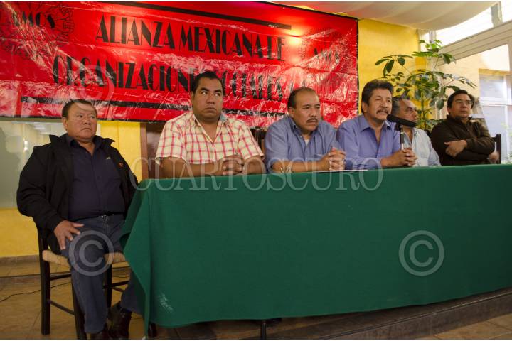 MÉXICO, D.F., 18FEBRERO2013.- José Manuel Sánchez, representante del grupo de pequeños empresarios ITEC; Antonio Mendoza, representante de la organización, de comerciantes de vías publicas CCAMPAAC; Nicolás Vázquez, represante de transportistas; Ely Homero Aguilar, representante del Frente Popular Francisco Villa, por vivienda; Manuel García, representante por el transporte del Edo. de México; y Dino Ortiz Rodríguez, dirigente social del Edo. de México; organizaciones pertenecientes al movimiento la Alianza Mexicana de Organizaciones Sociales AMOS, ofreció una conferencia para informar sobre su próxima movilización nacional "En defensa del vida" , frente al embate de los gobiernos y los grupos de poder económico contra los que menos tienen, que sera el 13 de marzo que partirá del Ángel de la Independencia a las cuatro de la tarde para llegar al zócalo. FOTO: SANDRA PÉREZ /CUARTOSCURO.COM