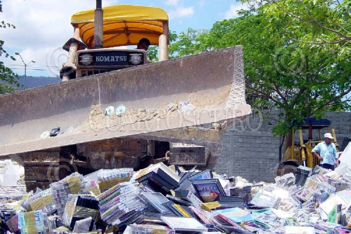 TUXTLA GUTIERREZ, CHIAPAS 07MAYO2004.- La delegación de la PGR, destruyó más de tres mil unidades de casettes, videos y DVD´s de origen ilícito que decomisó durante un operativo. La mercancía apócrifa esta valuada en 6 millones pesos. FOTO: Oscar León/CUARTOSCURO.COM