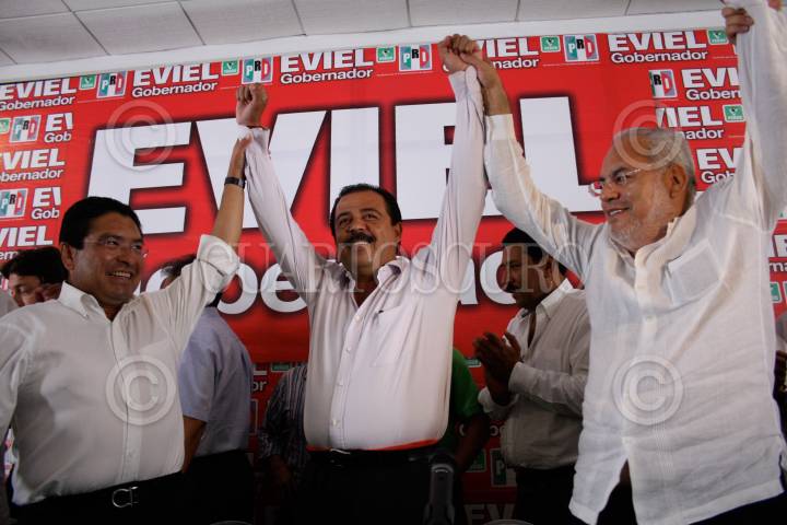 OAXACA, OAXACA, 04JULIO2010.- Adolfo Toledo Infanzón, dirigente del PRI en el estado, Eviel Perez Magaña candidato tricolor a la gubernatura del Estado, y el senador Carlos Jimenez Macias, ofrecieron conferencia de prensa donde se declaró el triunfo del candidato priista. FOTO: HUGO CRUZ/CUARTOSCURO.COM