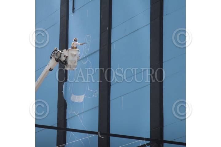 MÉXICO, D.F., 01MAYO2012.- Herakut, pintor realizando un graffiti mural para el festival de arte urbano "All City Canvas México 2012" sobre el edificio del periódico El Universal en la Avenida Bucareli de esta ciudad. FOTO: NIMROD CRUCES /CUARTOSCURO.COM