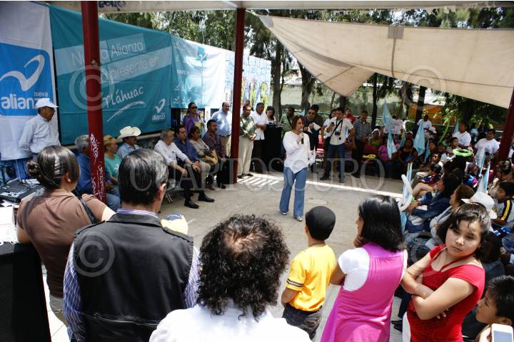 MÉXICO, D.F., 05MAYO2012.- Rosario Guerra, candidata a la Jefatura de gobierno del Distrito Federal por el Partido Nueva Alianza, entregando medallas simbólicas a niños que se le acercaron durante un mitin con simpatizantes de Tlahuac para presentar sus propuestas de gobierno, FOTO: NIMROD CRUCES /CUARTOSCURO.COM