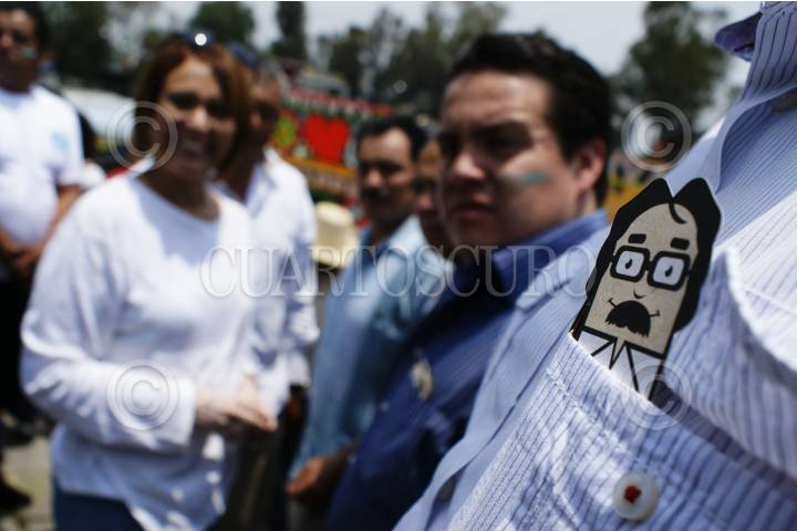 MÉXICO, D.F., 05MAYO2012.- Afiche de Gabriel Quadri, candidato a la presidencia de la república por el PANAL en la bolsa de la camisa de Carlos Del Valle; presidente del PANAL-DF siendo observado por Rosario Guerra, candidata a la Jefatura de gobierno del Distrito Federal por el Partido Nueva Alianza, durante un mitin en Tlahuac. FOTO: NIMROD CRUCES /CUARTOSCURO.COM