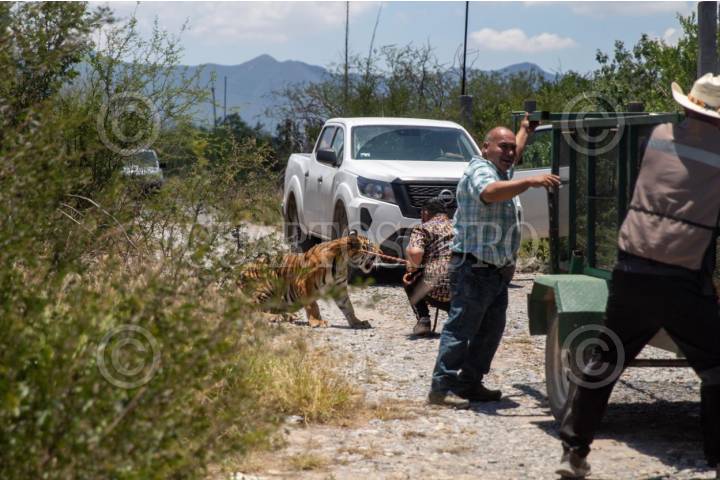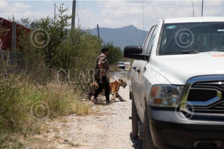 SALINAS VICTORIA, NUEVO LEÓN, 25JUNIO2025.- Un tigre de bengala fue capturado por elementos de Protección Civil y su propietario tras haberse escapado. El ejemplar, de 11 meses de edad, fue avistado en el predio “La Copina”, en el municipio de Salinas Victoria, Nuevo León. Al lugar acudieron Protección Civil estatal, personal de resguardo de vida silvestre y Fuerza Civil para su localización y captura. Según el director de Protección Civil, Erick Cavazos, el propietario —identificado como “Alan”— cuenta con los permisos correspondientes de PROFEPA y colaboró en el operativo. FOTO: PROTECCIÓN CIVIL NL / CUARTOSCURO.COM