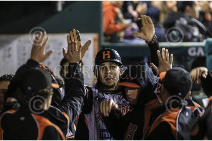 HERMOSILLO, SONORA, 27DICIEMBRE2015.- Jerry Owens celebra segunda carrera de Naranjeros, durante el tercer juego de la Serie entre Tomateros de Culiacán vs Naranjeros de Hermosillo en el Estadio Sonora. Segunda vuelta de la Liga Mexicana del Pacifico (LMP). FOTO: MARGARITA GARCÍA /CUARTOSCURO.COM