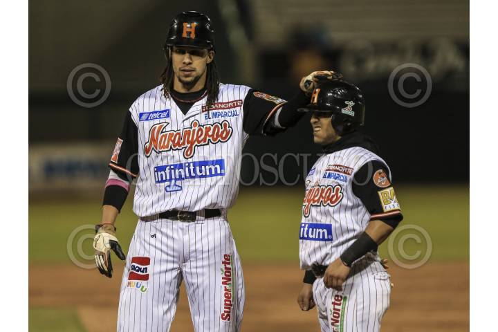 HERMOSILLO, SONORA, 27DICIEMBRE2015.- Jerry Owens y Jorge Flores en las bases, durante el tercer juego de la Serie entre Tomateros de Culiacán vs Naranjeros de Hermosillo en el Estadio Sonora. Segunda vuelta de la Liga Mexicana del Pacifico (LMP). FOTO: MARGARITA GARCÍA /CUARTOSCURO.COM