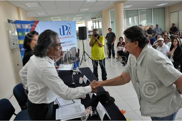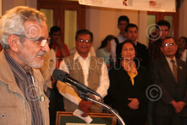 FRESNILLO, ZACATECAS. 26JULIO2009.-El maestro Carlos Jurado recibió el Premio a la Trayectoria Cuartoscuro 2009 de manos del director de la revista y agencia, Pedro Valtierra, en el marco de la entrega de premios del concurso “Dicen que por las noches...” al que convocó Cuartoscuro, y en el que participaron más de 200 fotógrafos de 20 estados del país. FOTO: SERGIO MAYORGA/ESPECIAL CUARTOSCURO.COM