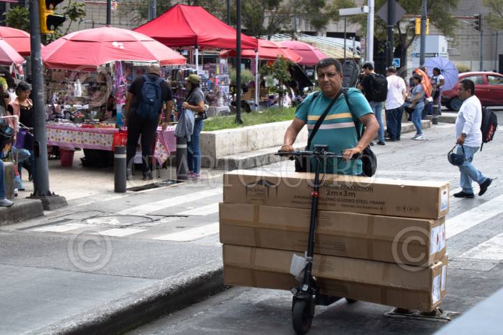 CIUDAD DE MÉXICO, 13SEPTIEMBRE2025.- Un hombre transporta cajas a bordo de su patín electríco en las inmediaciones del Centro Histórico. FOTO: CAMILA AYALA BENABIB/CUARTOSCURO.COM