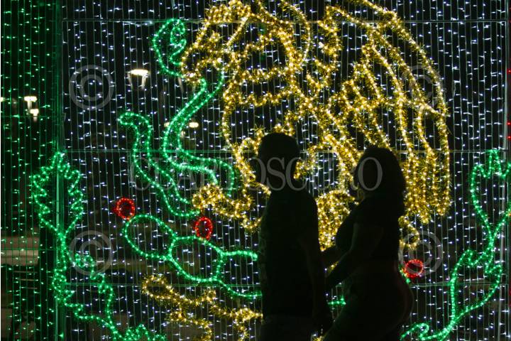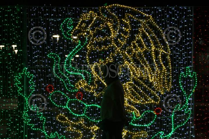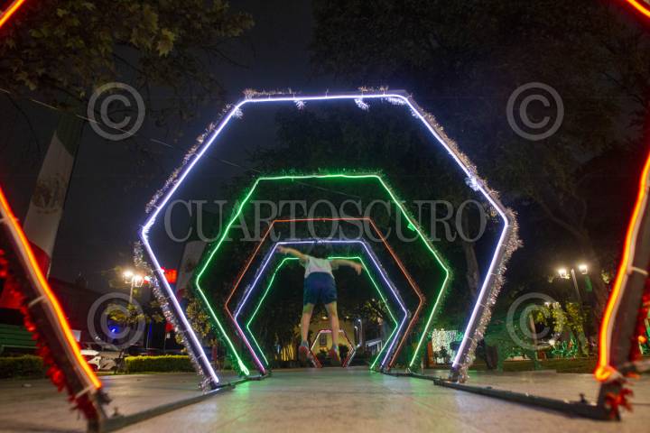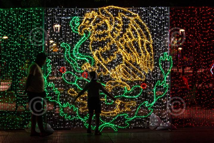 GUADALUPE, NUEVO LEÓN, 12SEPTIEMBRE2025.- Paseantes que acuden a la Plaza principal de Guadalupe, disfrutan de la iluminación alusiva a las celebraciones por el 215 aniversario de la independencia de México. FOTO: GABRIELA PÉREZ MONTIEL / CUARTOSCURO.COM