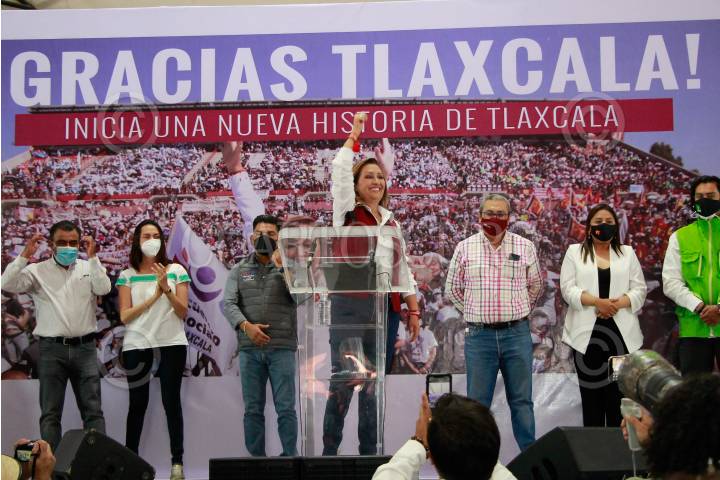 Lorena Cuéllar Cisneros, candidata a la gubernatura de Tlaxcala por la coalición Juntos Haremos Historia, celebró su virtual triunfo con sus simpatizantes.
