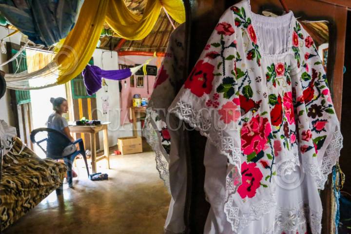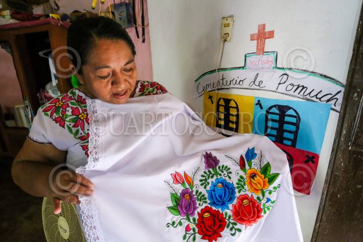 La señora Rosario tiene 45 años como artesana maya, ella aprendió de su mamá y ahora su hija Fátima es quien hereda esta honorable tradición. La elaboración de “la ropa de los fallecidos” sea pintados o bordados, les lleva entre dos y tres semanas ya que cada uno tiene un proceso distinto de confección, que va desde seleccionar el tamaño (mantel o paño) elegir las figuras como flores, animales, ángeles o algún diseño especial que acompañará el nombre del fallecido; el pintado, secado, la aplicación del sellador etc. Es el bordado el que requiere de más tiempo.