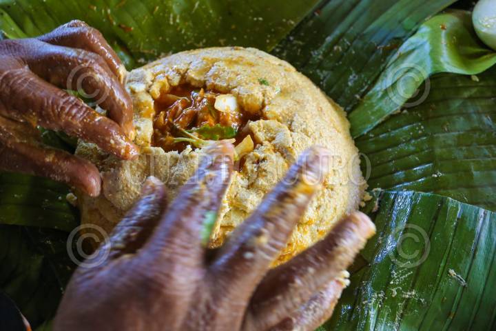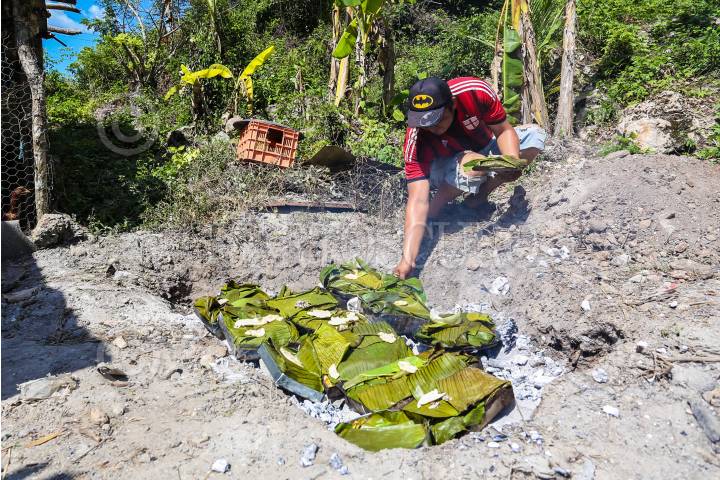 Los hombres cortan la leña y hacen el hoyo que sirve de contenedor para cocinar los pibes. Una hora es el tiempo en que los pibes están expuestos al calor constante provocado por las cenizas de la leña y las piedras calientes; y que bajo las láminas y la tierra se mantendrán en cocción hasta su extracción