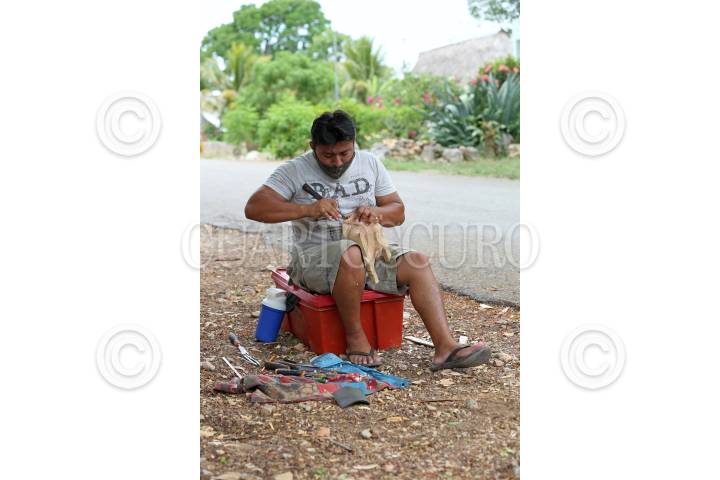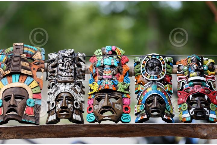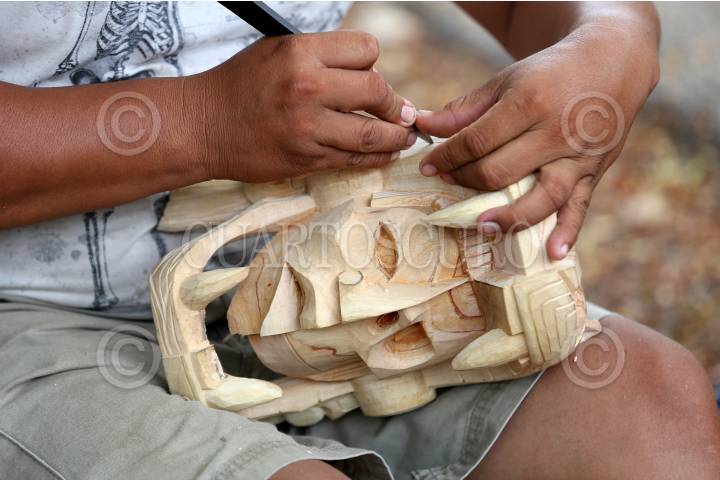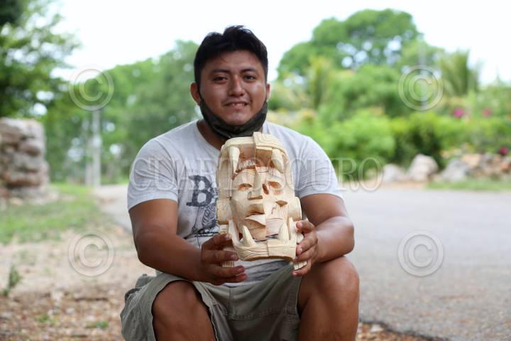 Un artesano de la comunidad de Yokdzonot trabaja en sus máscaras mayas, talladas a mano, para mantener a su familia a pesar de las bajas ventas por la falta de turistas.