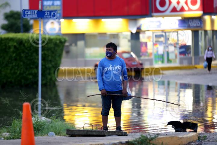 Una fuerte lluvia en Mérida dejo varias avenidas inundadas, trabajadores del ayuntamiento trabajaron para desazolver el drenaje.