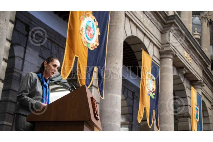 Claudia Sheinbaum, Jefa de Gobierno, durante la ceremonia de cancelación de la Estampilla Postal de 100 años del Escudo y Lema Universitario.