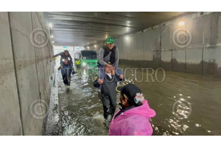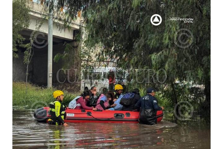 CIUDAD DE MÉXICO, 02SEPTIEMBRE2025.- Elementos de la Secretaria de Seguridad Ciudadana (SSC) auxiliaron a 63 pasajeros que habían quedado atrapados dentro de un camión de transporte público tras inundarse por las intensas lluvias registradas esta mañana. El incidente se registró en el bajo puente de Río Churubusco y Eje 1. FOTO: SSC/CUARTOSCURO.COM