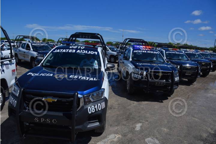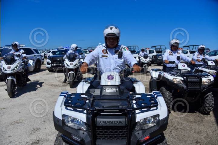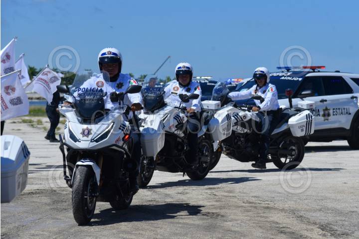 CAMPECHE,CAMPECHE.- La gobernadora Layda Sansores San Román y la secretaria de Seguridad, Marcela Muñoz, dieron el banderazo de salida a 91 nuevas unidades que fortalecerán la seguridad en Campeche. Con una inversión superior a 86 millones de pesos se adquirieron patrullas, motocicletas, cuatrimotos y equipo táctico especializado FOTO: MICHAEL BALAM/CUARTOSCURO.COM