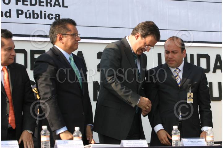 MEXICO, D.F. 26MARZO2007.- Joel Ortega, secretario de Seguridad Pública, Marcelo Ebrard, jefe de gobierno de la ciudad de México y Julio César Moreno, jefe delegacional de Venustiano Carranza al termino de la ceremonia de abanderamiento de la Unidad de Protección Ciudadana de Balbuena. FOTO: NELLY SALAS/CUARTOSCURO.COM