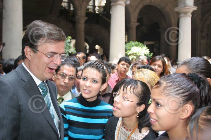 MEXICO, D.F. 26MARZO2007.- Marcelo Ebrard, jefe de gobierno del D. F. conversa con jovenes al termino de la ceremonia de firma de un fondo de apoyo a proyectos culturales y cientificos juveniles, en el antiguo Palacio del Ayuntamiento. FOTO: NELLY SALAS/CUARTOSCURO.COM