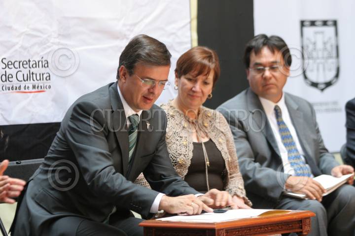 MEXICO, D.F. 26MARZO2007.- Marcelo Ebrard, jefe de gobierno del D. F. y Elena Cepeda de León, secretaria de Cultura del D.F. durante la ceremonia de firma de un fondo de apoyo a proyectos culturales y cientificos juveniles, en el antiguo Placio del Ayuntamiento. FOTO: NELLY SALAS/CUARTOSCURO.COM