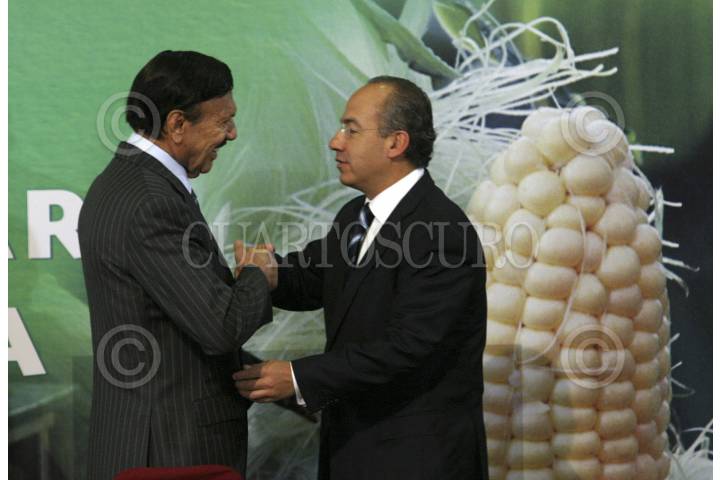 MEXICO, D.F. 18ENERO2007.- Felipe Calderón Hinojosa Y Roberto González Barrera, dueño de Grupo Maseca y BANORTE, (Quien Murio ayer en la ciudad de Houston, Tecas) durante la ceremonia de firma del Acuerdo para estabilizar el precio de la tortilla, en la residencia oficial de los Pinos. FOTO: NELLY SALAS /ARCHIVO/CUARTOSCURO.COM
