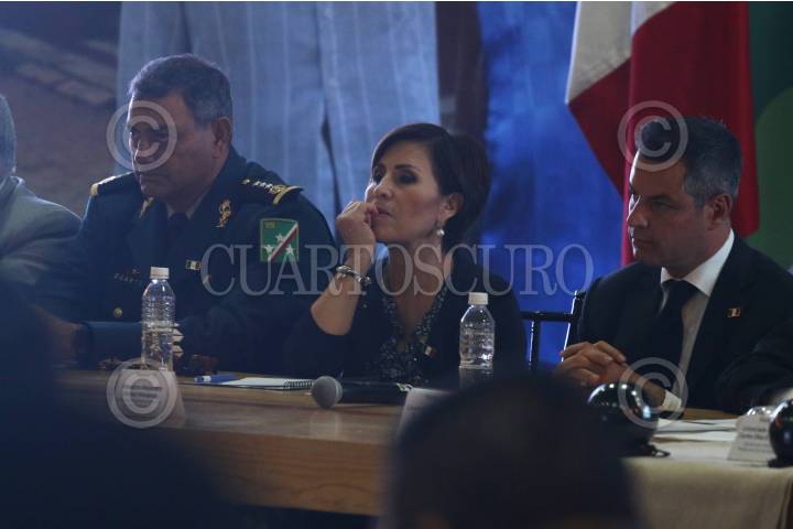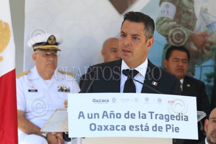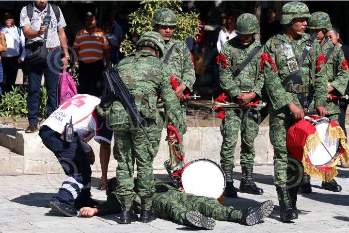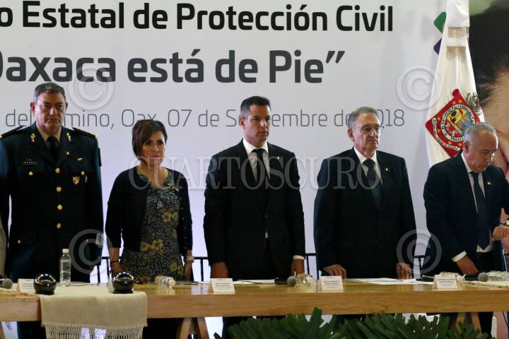 OAXACA, OAXACA, 07SEPTIEMBRE2018.- A un año del sismo del 7 de septiembre y que devastó 41 municipios oaxaqueños, principalmente en la región del Istmo de Tehuantepec, se realizó un acto solemne en la capital del estado que fue encabezado por el gobernador, Alejandro Murat, la titular de la Sedatu, Rosario Robles y Luis Felipe Puente coordinador Nacional de Protección Civil, durante dicho acto un soldado de la Octava Región Militar se desmayó. Posteriormente se realizó una sesión del Consejo Estatal de Protección Civil y finalmente una conferencia de prensa donde hablaron de los avances en la reconstrucción, de acuerdo con sus datos el 80 por ciento de viviendas dañadas ya presentan algún avance. FOTO: ARTURO PÉREZ ALFONSO/ CUARTOSCURO.COM