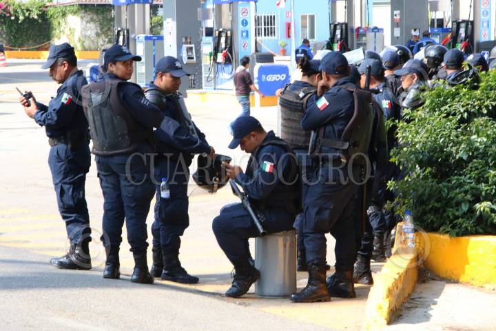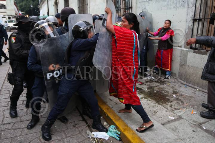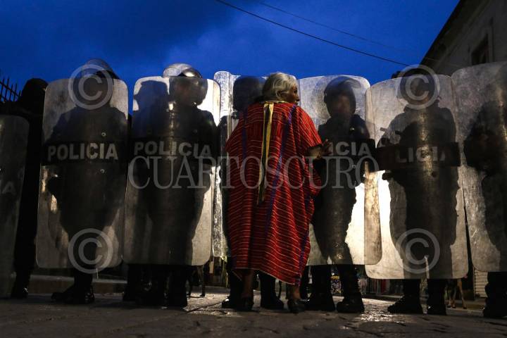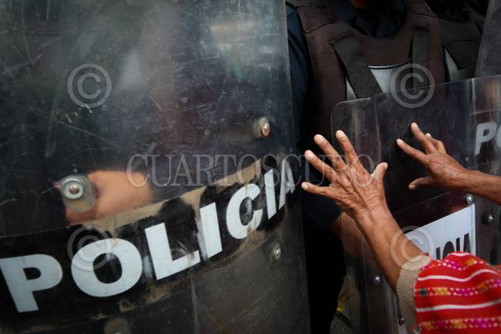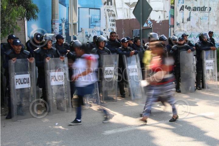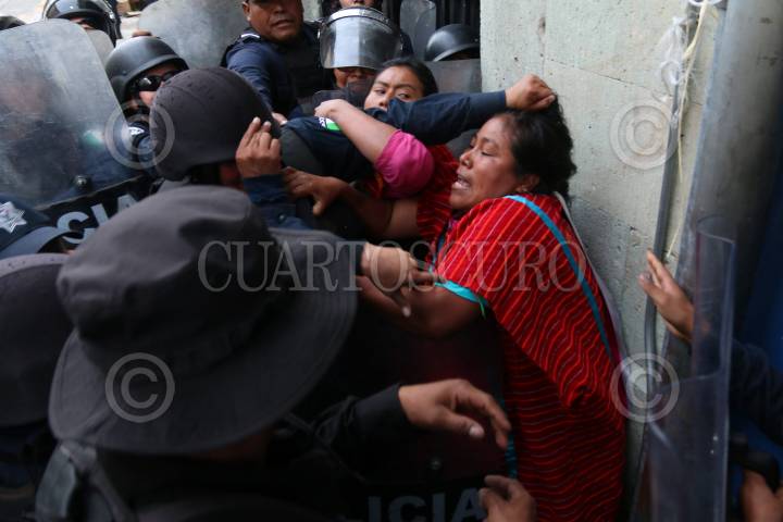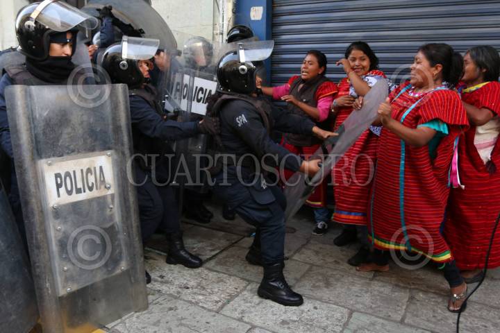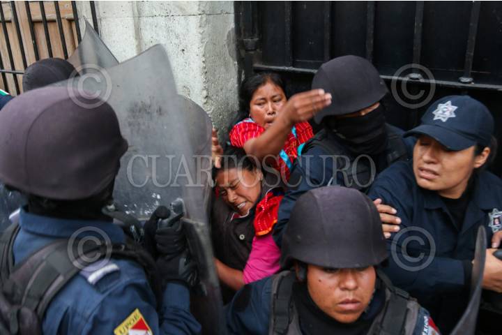 OAXACA, OAXACA, 15SEPTIEMBRE2018.- Elementos de la policía estatal replegaron la madrugada de este sábado a 12 indígenas triquis quienes desde hace 2 meses mantuvieron cerrada la puerta lateral del palacio de Gobierno ubicada en la calle de Flores Magón. Durante el operativo hubo intercambio de golpes entre las mujeres de la comunidad triqui encabezados por Lorena Merino quien cuenta con medidas cautelares dictadas por la Comisión Interamericana de Derechos Humanos y mujeres policía quienes portaban escudos. FOTO: ARTURO PÉREZ ALFONSO /CUARTOSCURO.COM