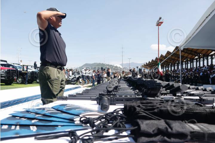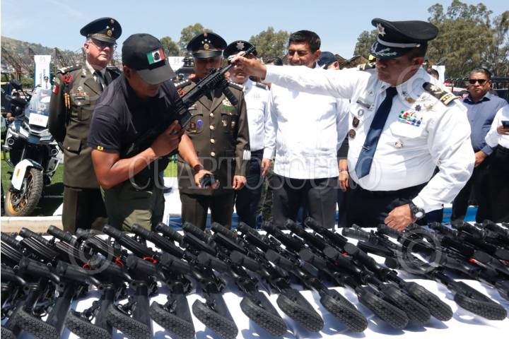 OAXACA DE JUÁREZ, OAXACA, 08SEPTIEMBRE09.- El gobierno de Oaxaca que encabeza el morenista Salomón Jara Cruz entregó este día armamento y vehículos a los cuerpos de seguridad pública, entre estos destacan 75 rifles de asalto Arad diseñados por Israel Weapon Industries (IWI), que fueron adquiridos a solicitud de la secretaría estatal de seguridad a través de la Dirección de Comercialización de Armamento y Municiones dependiente de la Secretaría de la Defensa Nacional. Mientras el gobierno de México ha condenado la violencia que Israel ejerce en Gaza, armamento de origen israelí es adquirido para su uso en el país. FOTO: CAROLINA JIMÉNEZ MARISCAL/CUARTOSCURO.COM