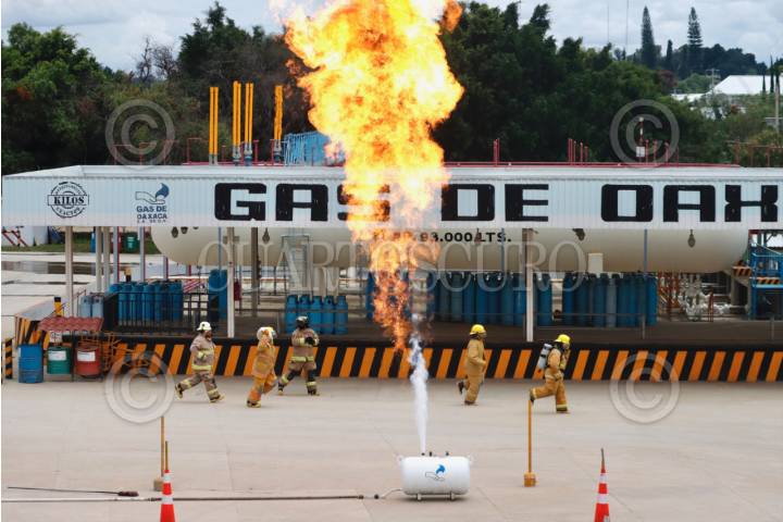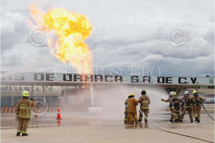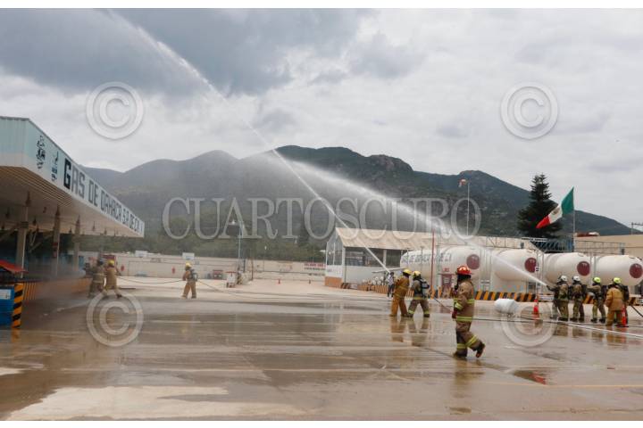 TLALIXTAC DE CABRERA, OAXACA, 12SEPTIEMBRE2025.- La Coordinación Estatal de Protección Civil y Gestión de Riesgos y la empresa Gas de Oaxaca realizaron un simulacro a escala mayor en las instalaciones de la gasera, con la finalidad de prevenir y fortalecer la capacidad de respuesta ante emergencias relacionadas con el manejo de materiales peligros. En esta acción participaron activamente bomberos y personal de la brigada de emergencias de la empresa, las acciones también son derivadas de la explosión ocurrida el pasado 10 de septiembre en la Ciudad de México. Además, el gobierno de Oaxaca ha determinado un horario para la circulación de pipas que transporten materiales peligrosos, pues únicamente podrán circular entre las 22:00 a las 04:00 horas en zonas urbanas. FOTO: CAROLINA JIMÉNEZ MARISCAL/CUARTOSCURO.COM