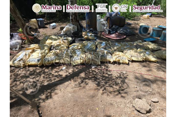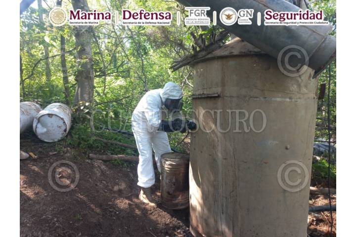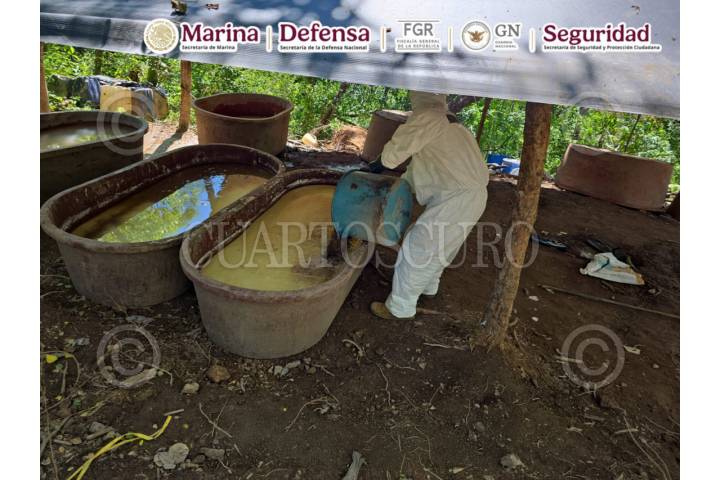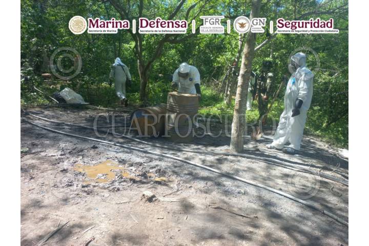 CARRICITOS, DURANGO, 08SEPTIEMBRE2025.- En operativo conjunto de la SEMAR, FGR, SEDENA, Guardia Nacional y la Secretaría de Seguridad y Protección Ciudadana (SSPC) localizaron y neutralizaron dos laboratorios clandestinos empleados para la elaboración de sustancias ilícitas, donde se aseguraron aproximadamente 21 toneladas de presunta metanfetamina. Esta acción se llevó a cabo durante recorridos de reconocimiento terrestre, cuando personal naval localizó y desmanteló dos laboratorios clandestinos. En el lugar se aseguraron aproximadamente 21,000 kilogramos de metanfetamina ya procesada, así como diversos precursores químicos, entre ellos: 1,000 litros de ácido clorhídrico. El material asegurado fue puesto a disposición del agente del Ministerio Público correspondiente. FOTO: CORTESÍA SEMAR/CUARTOSCURO.COM