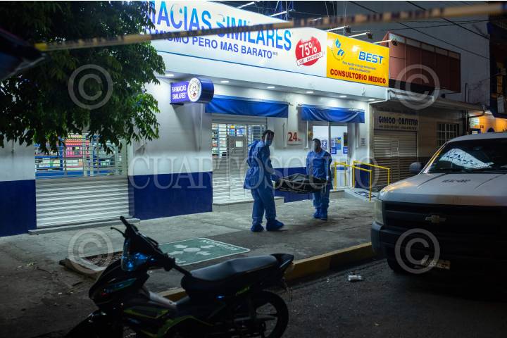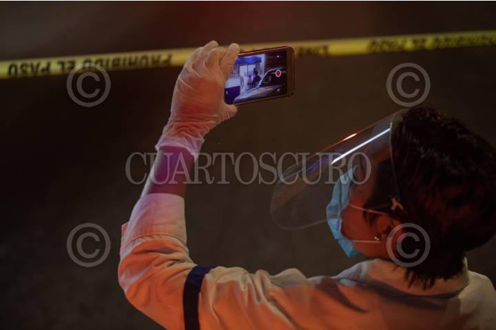 Trabajadores de una funeraria y peritos de la Fiscalía realizan diligencias para levantar el cuerpo de una mujer de la tercera edad, que falleció a la espera de ser atendida por presentar síntomas de COVID-19, en un consultorio de una farmacia particular de la Ciudad de Veracruz.