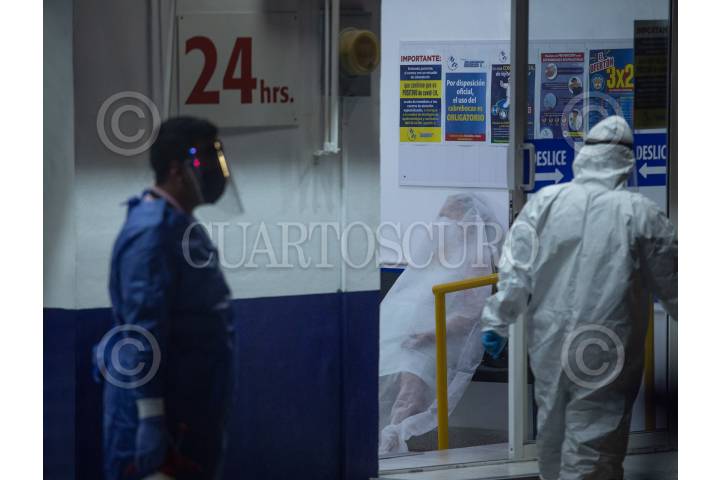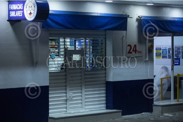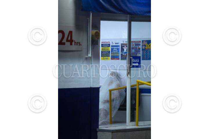 Un empleado realiza una llamada mientras el cuerpo de una mujer de la tercera edad que falleció a la espera de ser atendida por presentar sintomas de COVID-19, permanece fuera del consultorio de una farmacia particular de la ciudad de Veracruz.