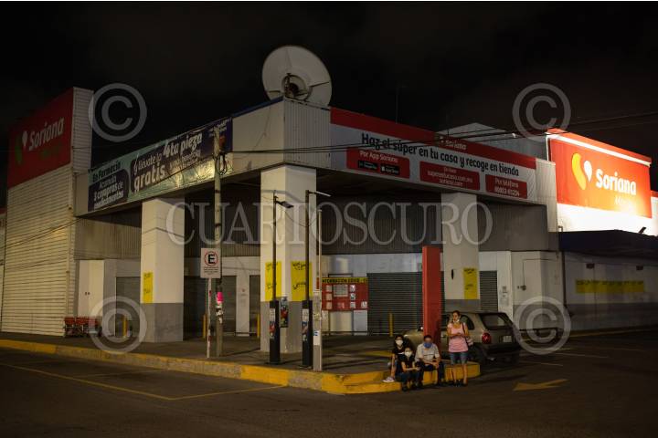 Una familia observa a lo lejos el traslado del cuerpo de una mujer de la tercera edad que falleció a la espera de ser atendida por presentar sintomas de COVID-19 en un consultorio de una farmacia particular de la Ciudad de Veracruz.