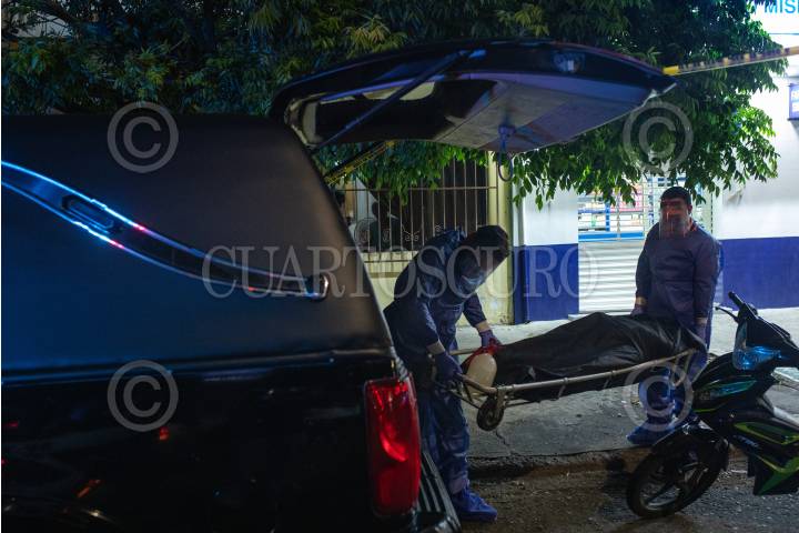 Trabajadores de una funeraria trasladan el cuerpo de una mujer de la tercera edad que falleció a la espera de ser atendida por presentar sintomas de COVID-19 en un consultorio de una farmacia particular de la Ciudad de Veracruz.
