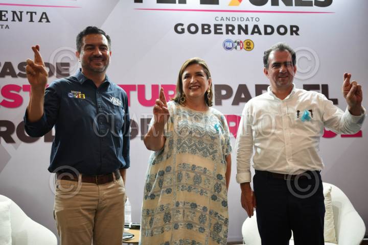 BOCA DEL RIO, VERACRUZ., 01ABRIL2024.- Los candidatos de Fuerza y Corazón por México; Miguel Ángel Yunes Márquez, Senado; Xóchitl Gálvez, Presidencia de la República y Pepe Yunes, a gobernador, sostuvieron un encuentro con militantes. FOTO: FÉLIX MÁRQUEZ / CUARTOSCURO.COM