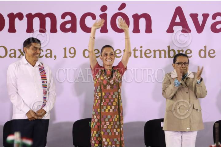 OAXACA, OAXACA, 19SEPTIEMBRE2025.- La presidenta de la República Claudia Sheinbaum Pardo visitó Oaxaca esta noche para rendir un informe sobre su primer año de gobierno. Rodeada de cientos de personas y acompañada de Rosa Icela Rodríguez, secretaria de Gobernación, y el gobernador de Oaxaca, Salomón Jara Cruz, habló sobre los logros de su administración y mencionó que con la llegada de la Cuarta Transformación se han resarcido problemáticas creadas por los gobiernos neoliberales. FOTO: CAROLINA JIMÉNEZ MARISCAL/CUARTOSCURO.COM