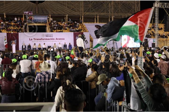 OAXACA, OAXACA, 19SEPTIEMBRE2025.- La presidenta de la República Claudia Sheinbaum Pardo visitó Oaxaca esta noche para rendir un informe sobre su primer año de gobierno. Rodeada de cientos de personas y acompañada de funcionarios de su gobierno y el gobernador de Oaxaca, Salomón Jara Cruz, habló sobre los logros de su administración y mencionó que con la llegada de la Cuarta Transformación se han resarcido problemáticas creadas por los gobiernos neoliberales. FOTO: CAROLINA JIMÉNEZ MARISCAL/CUARTOSCURO.COM