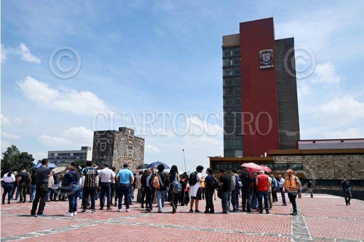 CIUDAD DE MÉXICO, 19SEPTIEMBRE2025.- Decenas de académicos y estudiantes participaron en el simulacro nacional realizado en las instalaciones de Ciudad Universitaria. FOTO: UNAM/CUARTOSCURO.COM