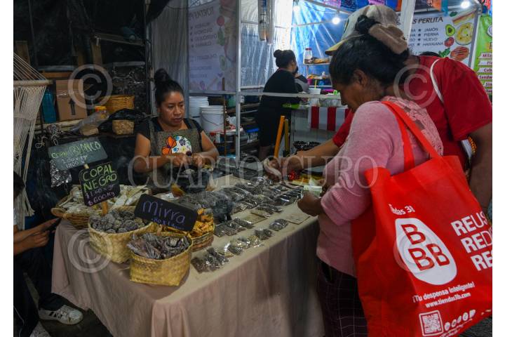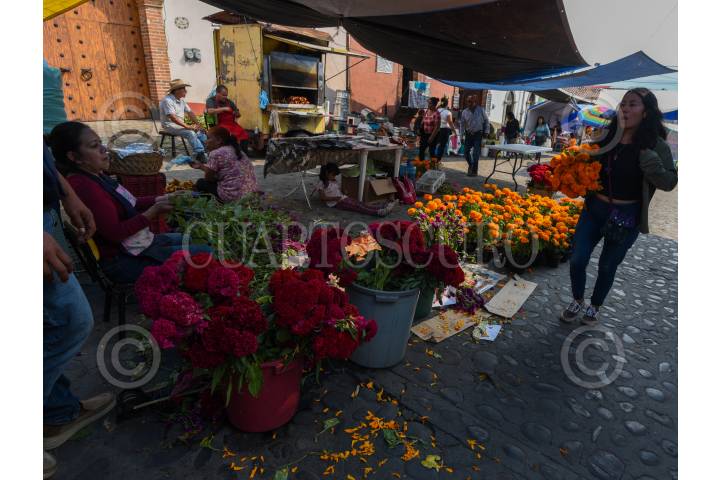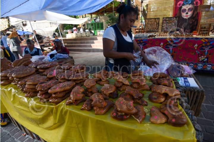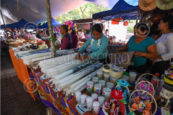 MALINALCO, ESTADO DE MÉXICO, 31OCTUBRE2024.- Los olores, colores y sabores se mezclan en los días previos al celebración del Día de Muertos en Malinalco, con el mercado que se instala en donde la gente puede encontrar ceras, pan, incienso, flores, fruta, alfeñique que utilizarán para sus ofrendas. FOTO: CRISANTA ESPINOSA AGUILAR /CUARTOSCURO.COM