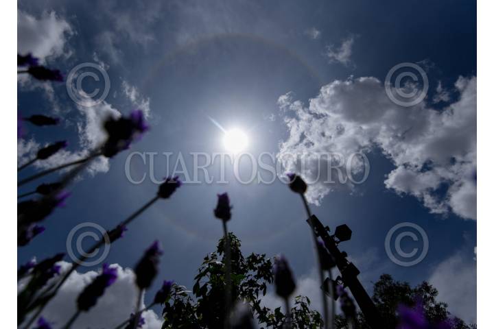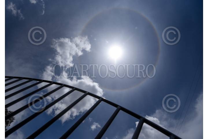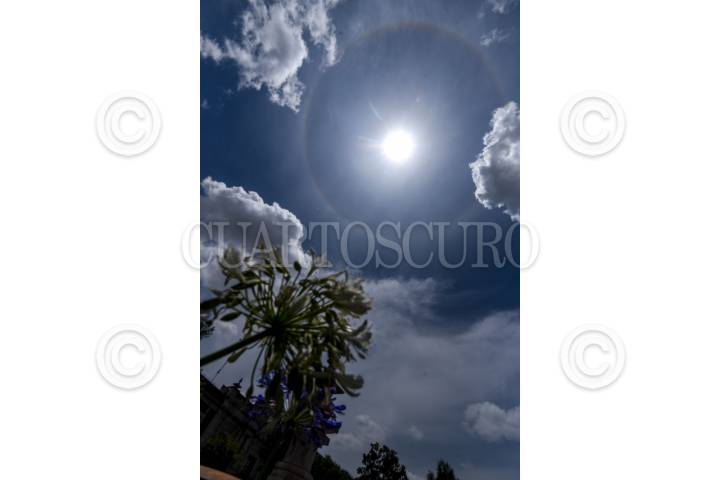 TOLUCA, ESTADO DE MÉXICO, 10 JULIO 2025.- En la capital mexiquense se pudo observar un halo solar, un fenómeno óptico, formando un anillo de luz alrededor del sol con colores similares al del arcoíris. Se registra por la refracción de luz solar a través de cristales de hielo en las nubes. FOTO: CRISANTA ESPINOSA AGUILAR/CUARTOSCURO.COM