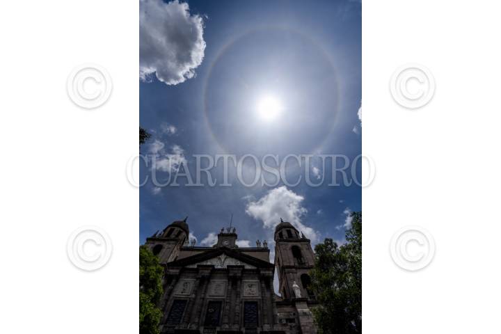 TOLUCA, ESTADO DE MÉXICO, 10 JULIO 2025.- La Catedral de Toluca como escenario del halo solar que se observó este día en la capital mexiquense, un fenómeno óptico, formando un anillo de luz alrededor del sol con colores similares al del arcoíris. Se registra por la refracción de luz solar a través de cristales de hielo en las nubes. FOTO: CRISANTA ESPINOSA AGUILAR/CUARTOSCURO.COM