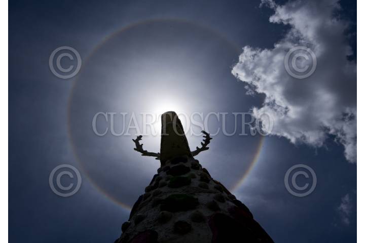 TOLUCA, ESTADO DE MÉXICO, 10 JULIO 2025.- Con la figura de alfeñique que se encuentra en la Plaza González Arratia en Toluca se enmarca con el halo solar que este día se pudo observar, un fenómeno óptico, formando un anillo de luz alrededor del sol con colores similares al del arcoíris. Se registra por la refracción de luz solar a través de cristales de hielo en las nubes. FOTO: CRISANTA ESPINOSA AGUILAR/CUARTOSCURO.COM