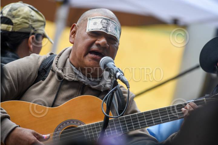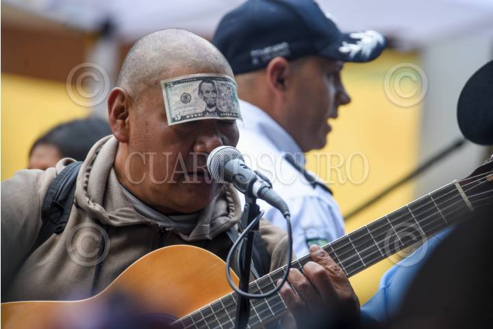 ZINACANTEPEC, ESTADO DE MÉXICO, 22AGOSTO2025.- Un hombre que canta se coloca un billete de 5 dólares por encima de sus ojos, esto durante el espectáculo que ofrece para amenizar a los comensales de la 12 Feria del Marisco en Zinacantepec. FOTO: CRISANTA ESPINOSA AGUILAR