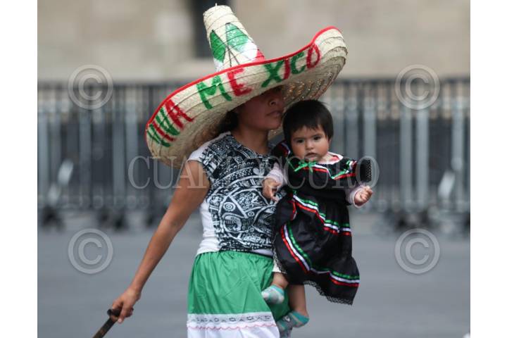 CIUDAD DE MÉXICO, 02SEPTIEMBRE2025.- Con un sombrero charro, una madre carga a su hija en la plancha del Zócalo capitalino. FOTO: GRACIELA LÓPEZ/CUARTOSCURO.COM