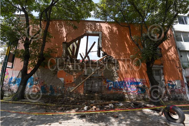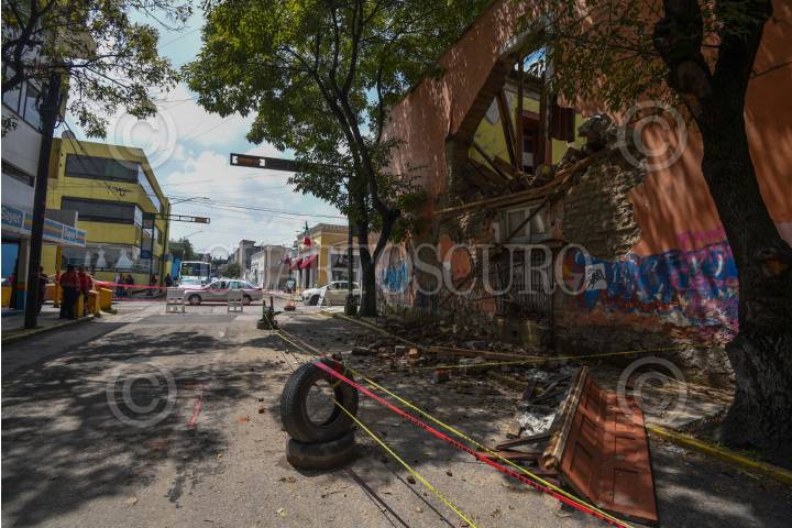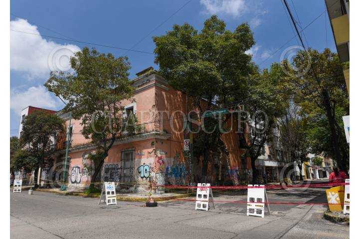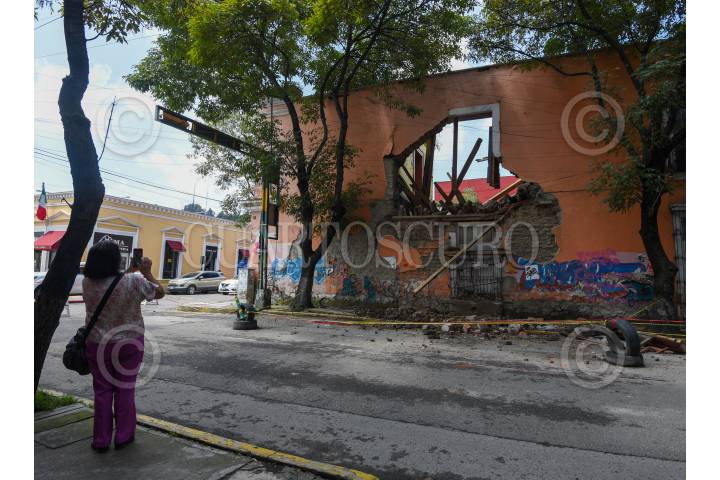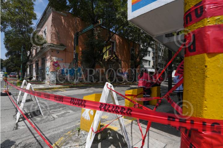 TOLUCA, ESTADO DE MÉXICO, 17SEPTIEMBRE2024.- Continúa colapsando la fachada de una vieja casa ubicada en la avenida Bravo esquina con Instituto Literario en el centro de Toluca, la cual por las lluvias recientes ha sufrido varios daños, PC de Toluca acordono la zona y cerro la circulación de dicha calle a vehículos para evitar algún accidente. FOTO: CRISANTA ESPINOSA AGUILAR /CUARTOSCURO.COM