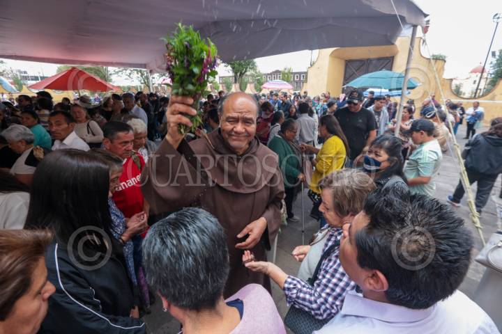 METEPEC, ESTADO DE MÉXICO, 15MAYO2025.- Figuras de San Isidro Labrador desfilaron por las principales calles de Metepec, Santo Patrono de este municipio, para escuchar misa en el ex Convento de San Juan Bautista y pedir por un buen año de cosechas. Ataviados con sus trajes de gala, las figuras de diferentes tamaños y materiales fueron acomodadas en el atrio de la iglesia. También se pudieron observar retablos elaborados de semillas que son elaborados a mano y con gran fervor. FOTO: CRISANTA ESPINOSA AGUILAR /CUARTOSCURO.COM