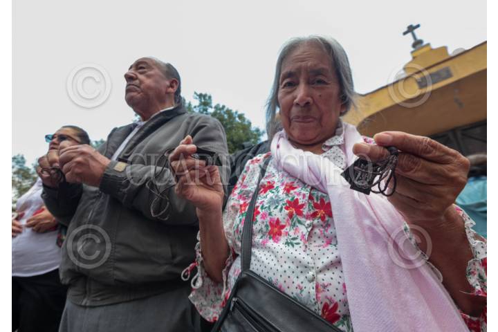 TOLUCA, ESTADO DE MÉXICO, 16JULIO2025.- Devotos de la Virgen del Carmen son bendecidos en la Iglesia del Carmen en Toluca durante la misa por la celebración, llevando consigo imágenes y escapularios para ser bendecidos. FOTO: CRISANTA ESPINOSA AGUILAR /CUARTOSCURO.COM