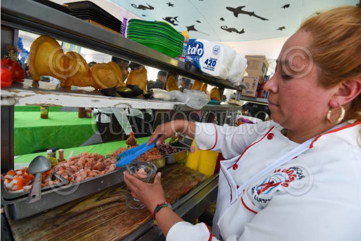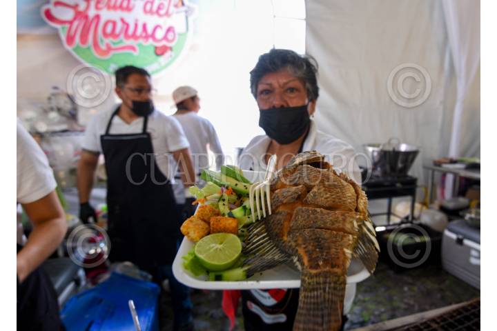 ZINACANTEPEC, ESTADO DE MÉXICO, 22AGOSTO2025.- Una participante de la 12 Feria del Marisco en Zinacantepec muestra uno de los platillos que se preparan para la degustación de los visitantes, con una gran variedad de sabores los asistentes podrán disfrutar diversos platillos para todos los gustos y bolsillos, ubicados en el centro del municipio de Zinacantepec estarán del 22 al 24 de agosto y se espera la llegada de más de 60 mil visitantes. FOTO: CRISANTA ESPINOSA AGUILAR/CUARTOSCURO.COM