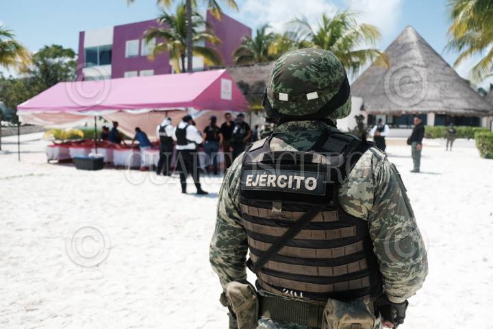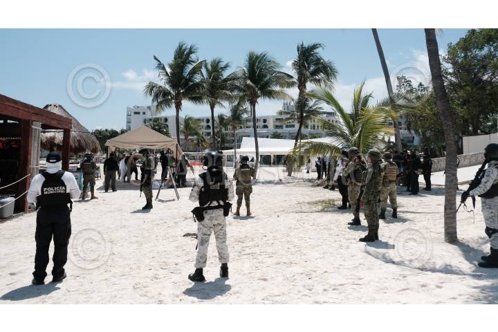 Operativo conjunto del Ejército, Marina, Guardia Nacional y Policía Quintana Roo, para retirar a vendedores ambulantes y prestadores de servicios turísticos, como masajistas, vendedores de tour, entre otros, en la playa del Hotel Temptation de la Zona Hotelera.